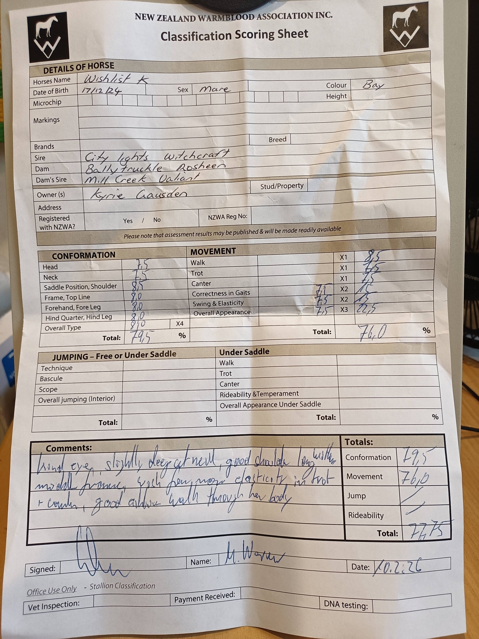 Luna underwent assessment by Matthias Werner through the New Zealand Warmblood Association on 10 February 2026 where she gained a whopping 8.5 for her walk. He was very complimentary about her future potential.