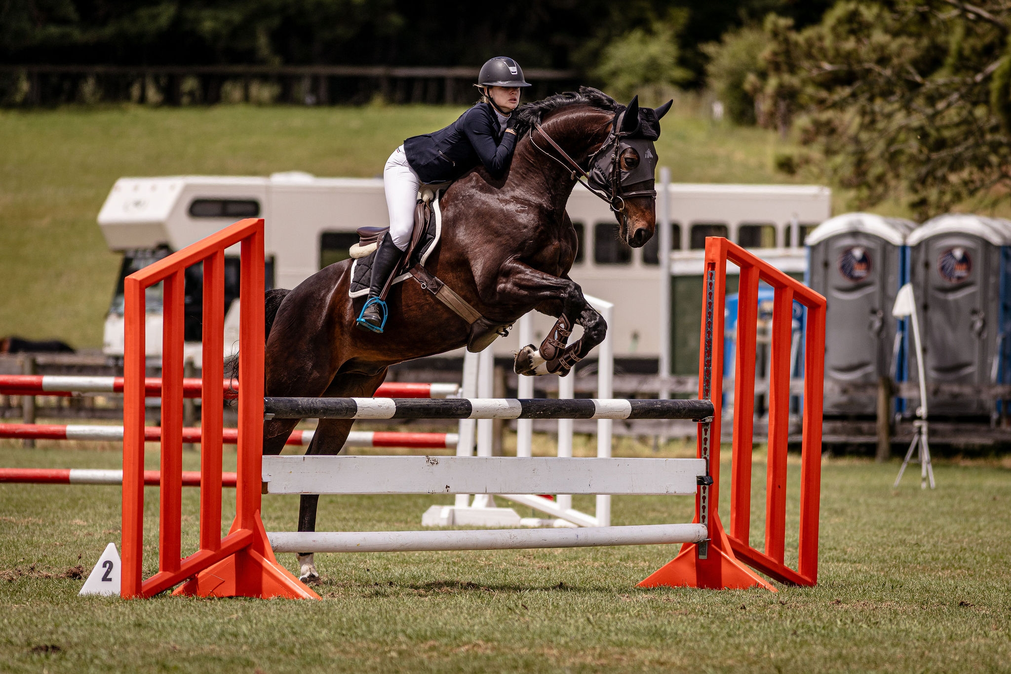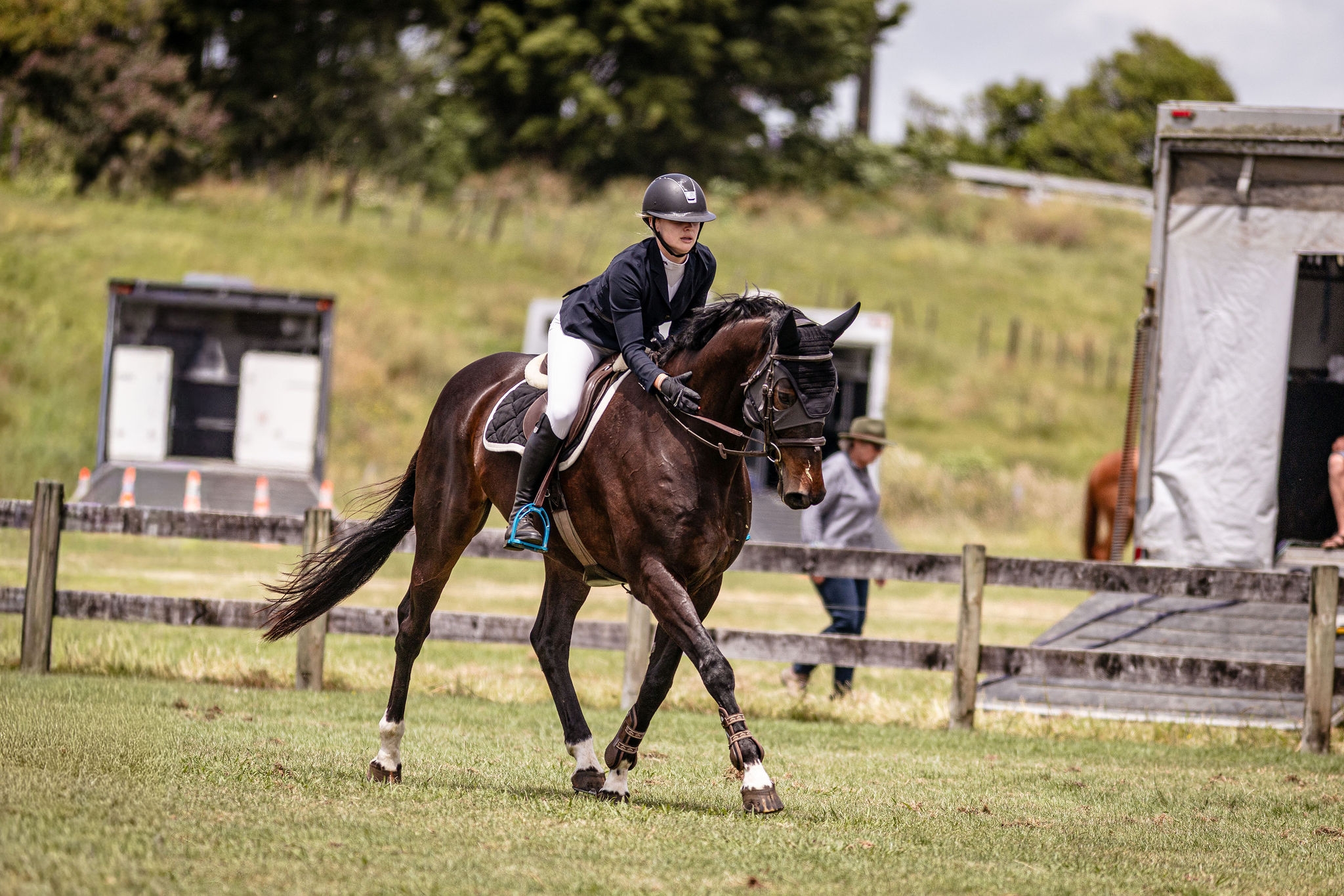He is great to truck, float, clip, shoe, worm, hack out and is easy to have around at home. He can be horse shy in a busy warm up environment. Would suit a confident rider.