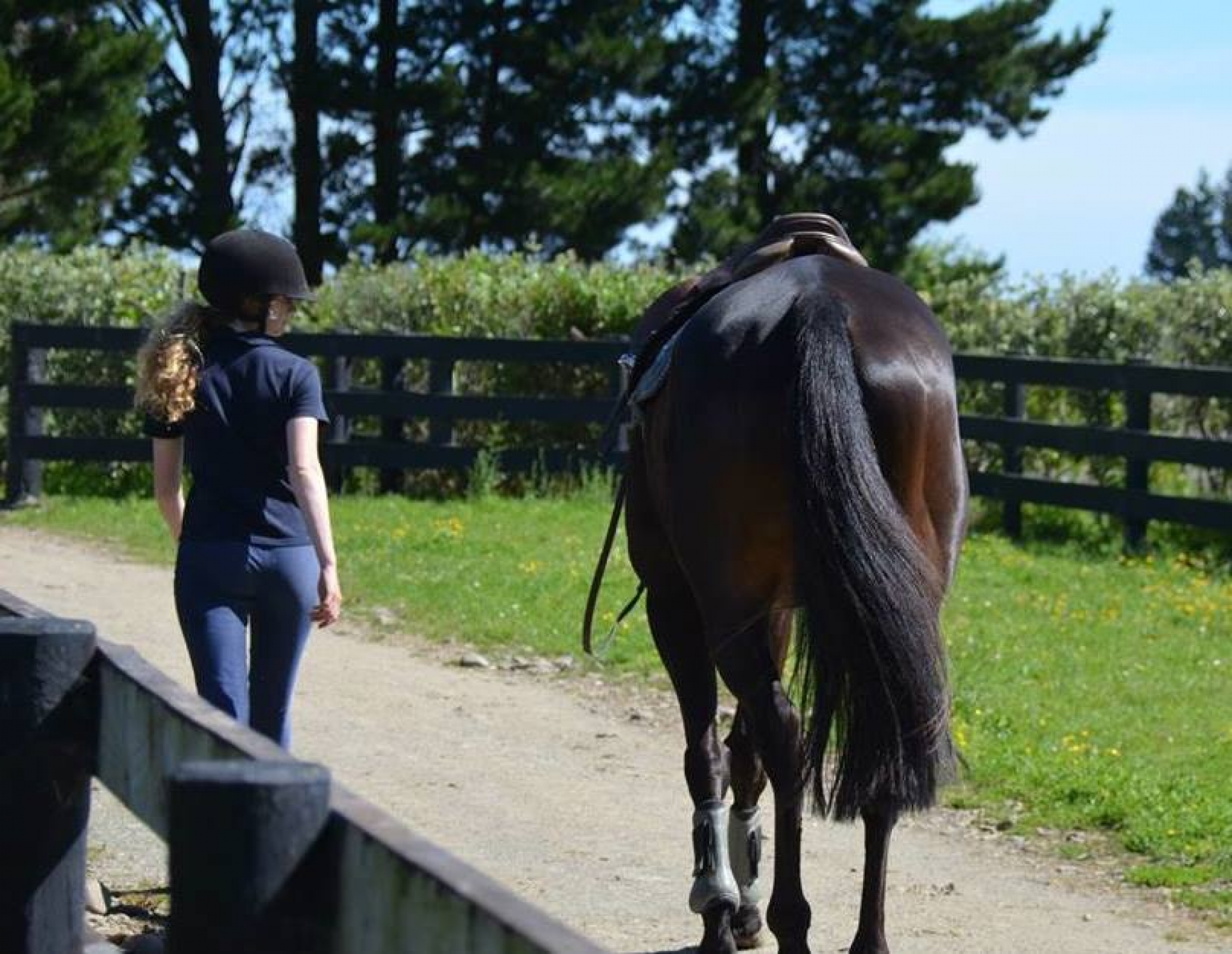 NZ city girl at a family and friends catch up, picked flowers, had a swing, looked at the farm animals, found a horse, jumped on and rode for hours. No need for a bridle and saddle.